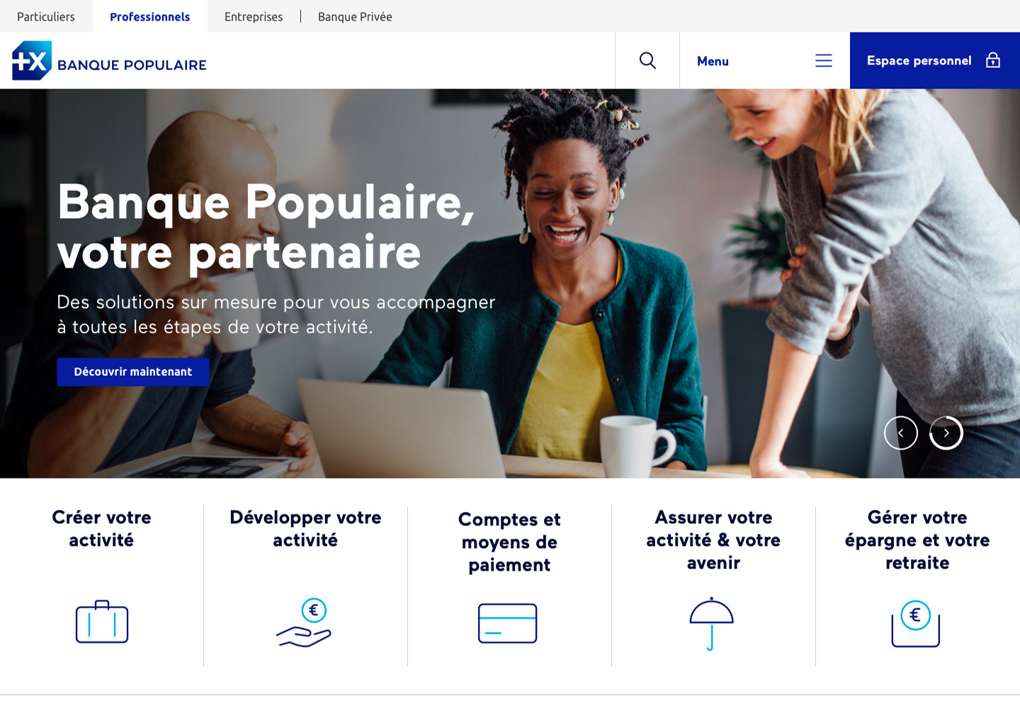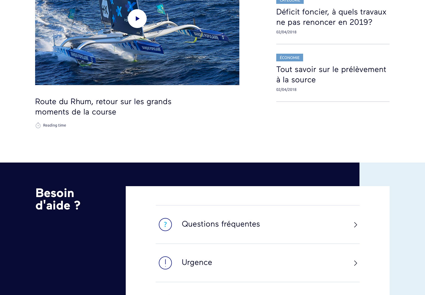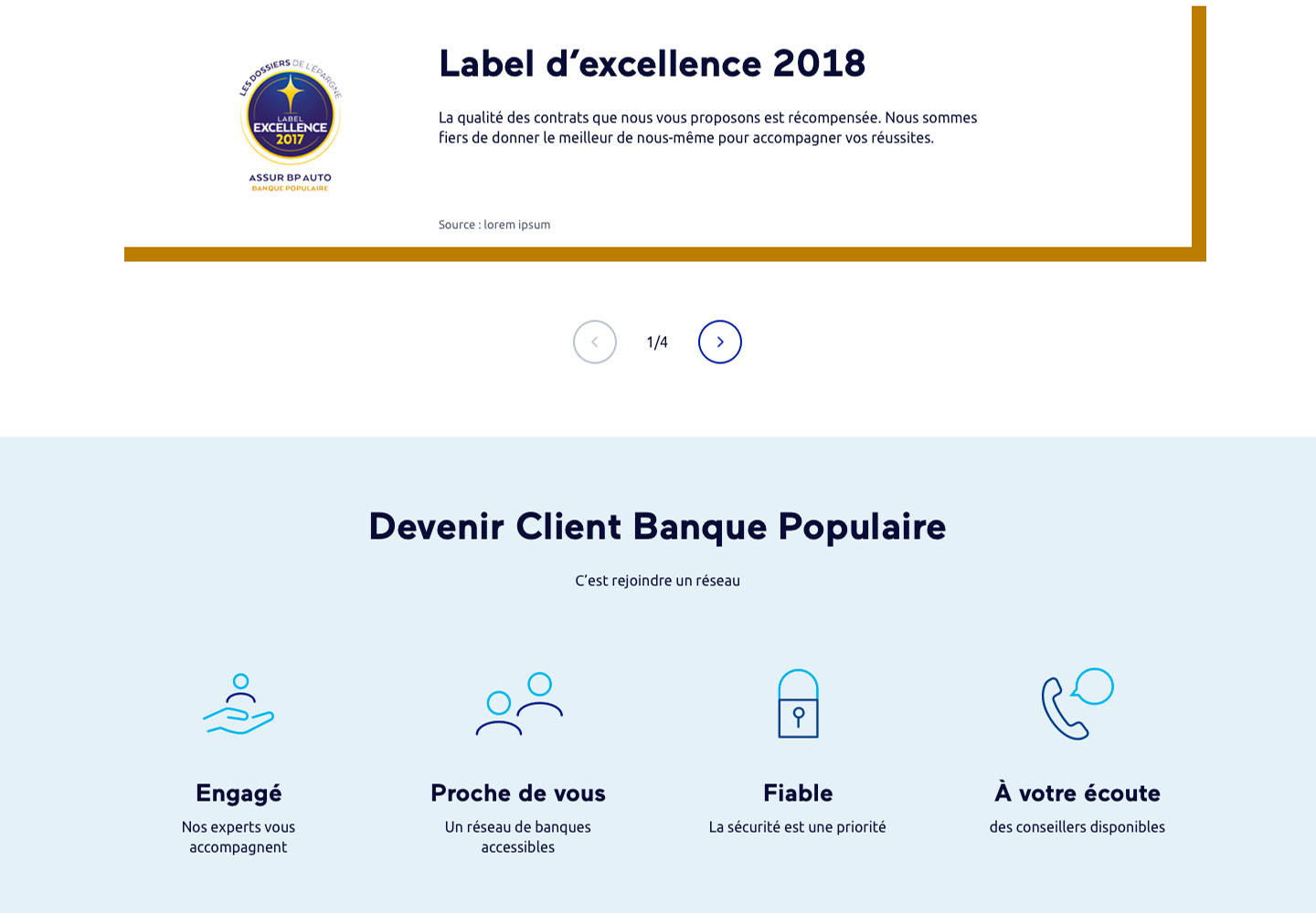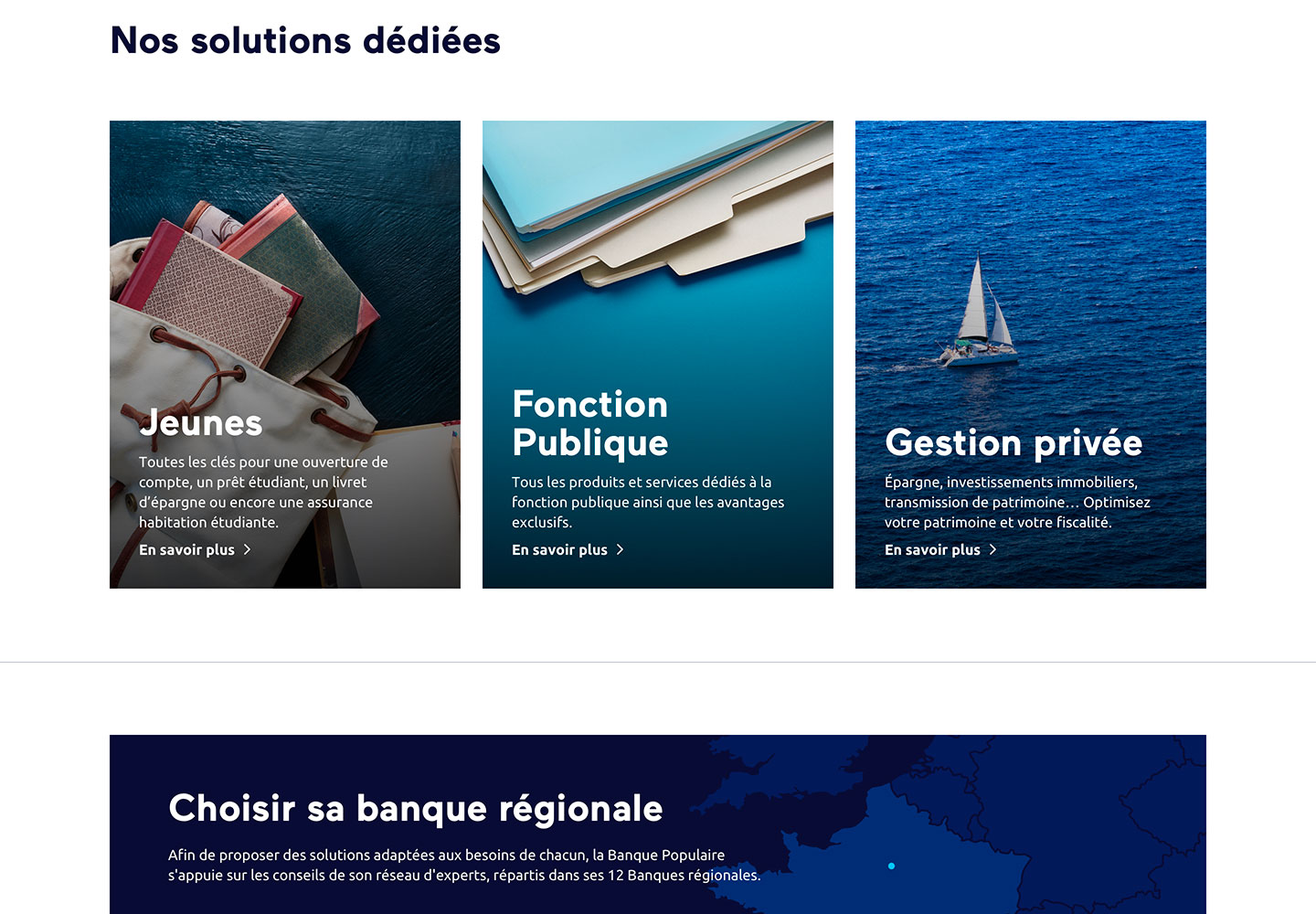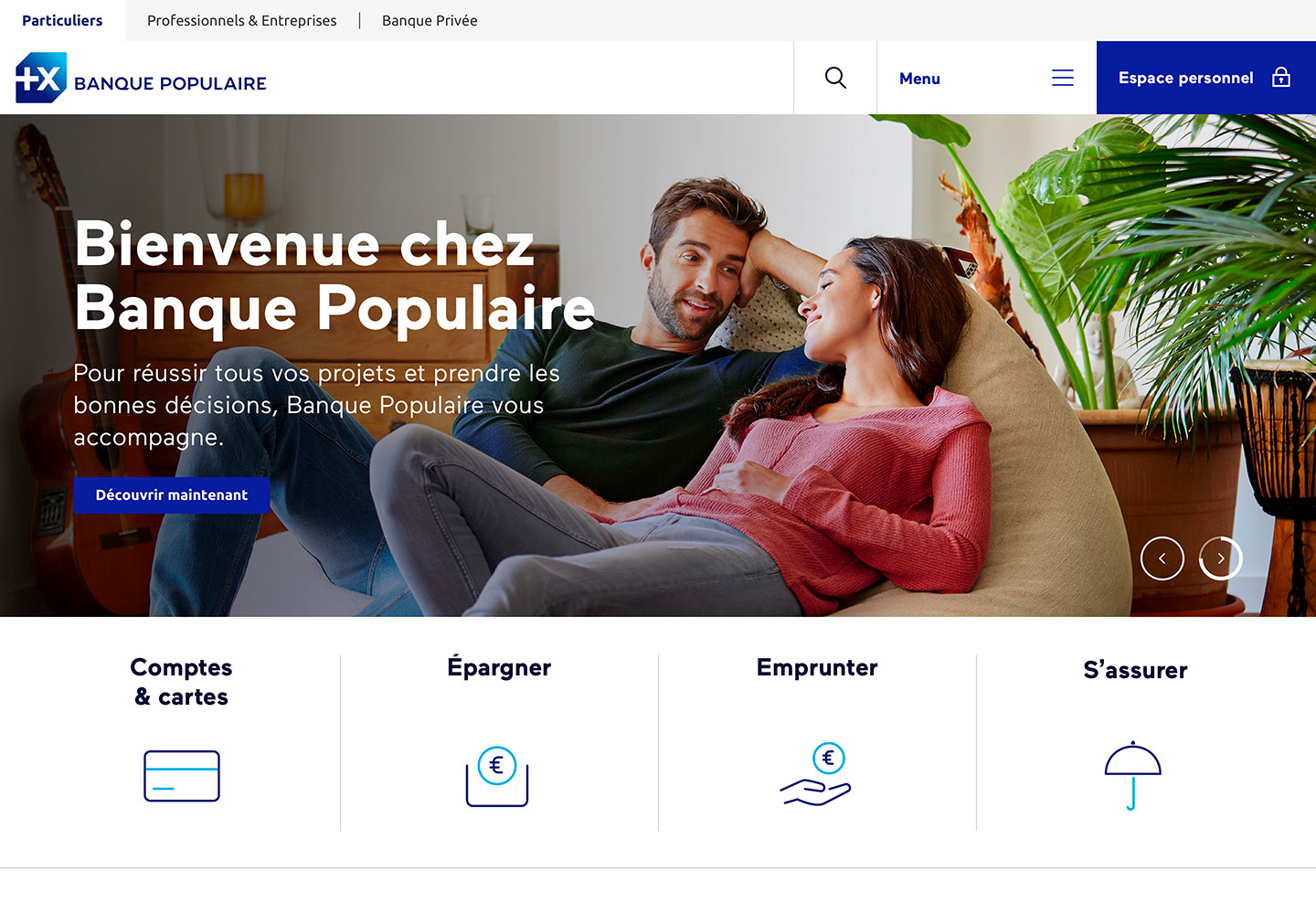 Banque Populaire In 2018, Banque Populaire ask us to redesign their commercial website. The challenge was to make complex information accessible to all by designating ergonomically. Website: banquepopulaire.fr Role: UI Designer Team: Truc Trinh (Lead UI), Etienne Machicoane (Lead UX), Matthieu Allioud (UX) - Publicis Sapient
