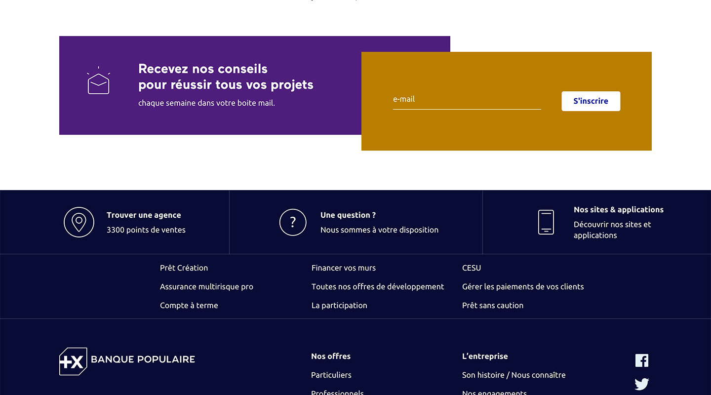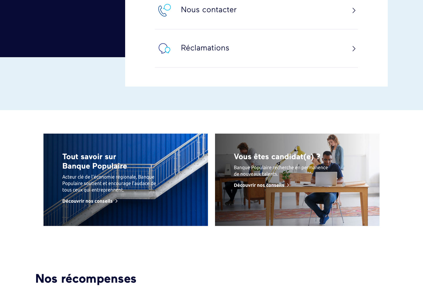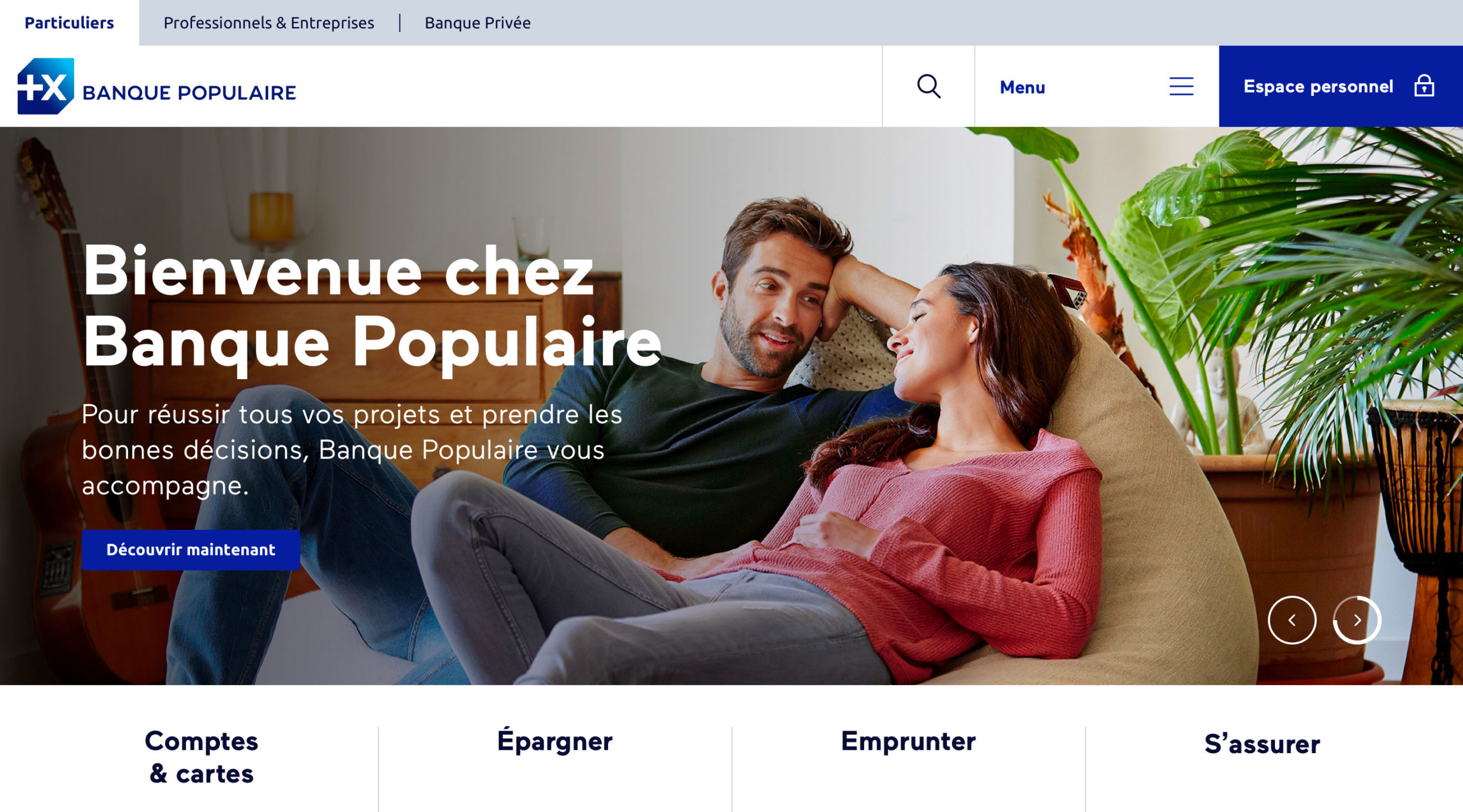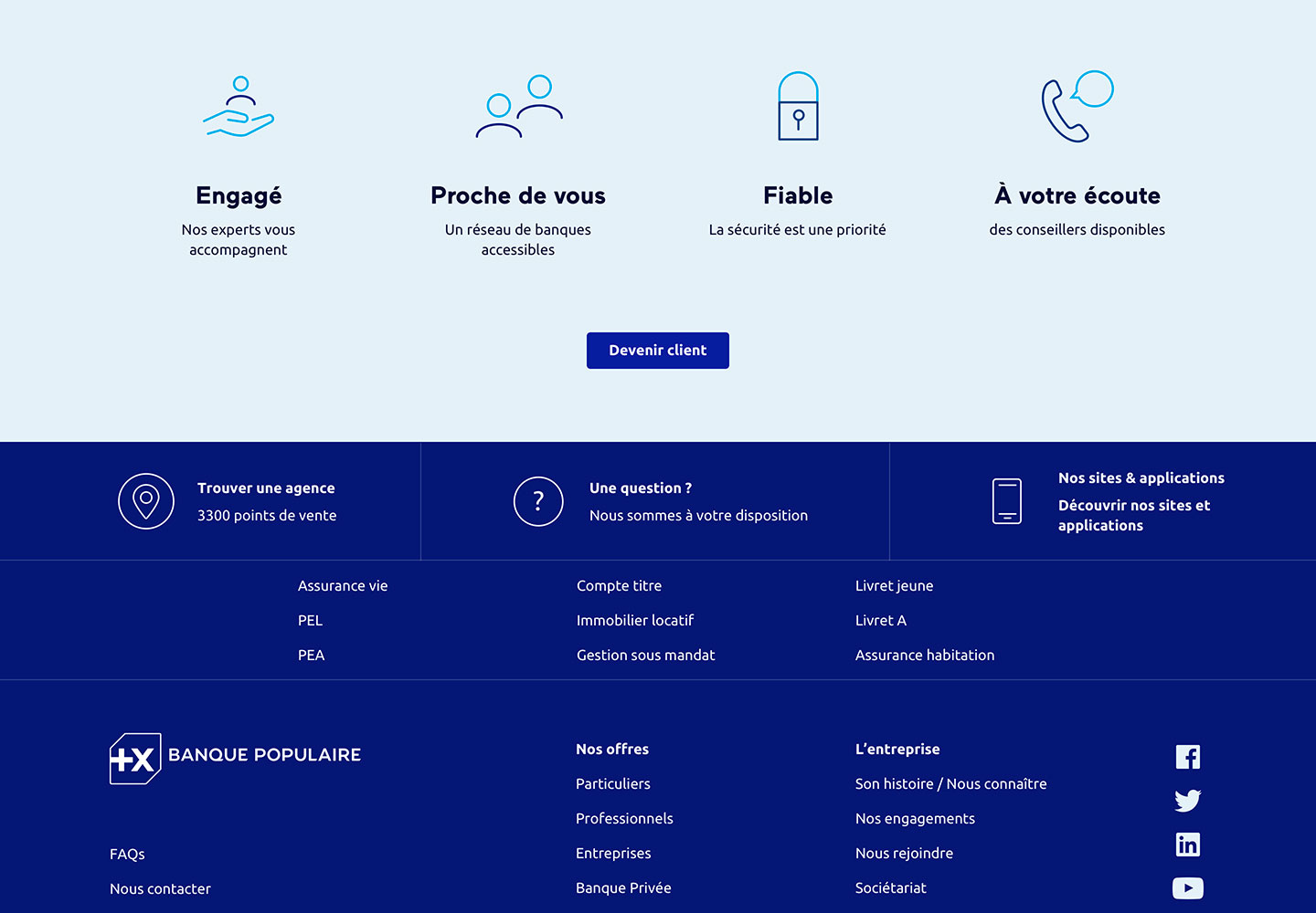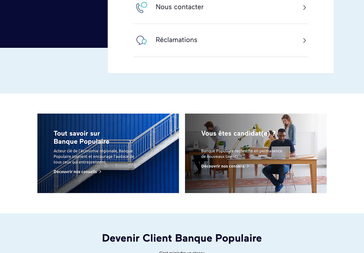 Banque Populaire In 2018, Banque Populaire ask us to redesign their commercial website. The challenge was to make complex information accessible to all by designating ergonomically. Website: banquepopulaire.fr Role: UI Designer Team: Truc Trinh (Lead UI), Etienne Machicoane (Lead UX), Matthieu Allioud (UX) - Publicis Sapient
